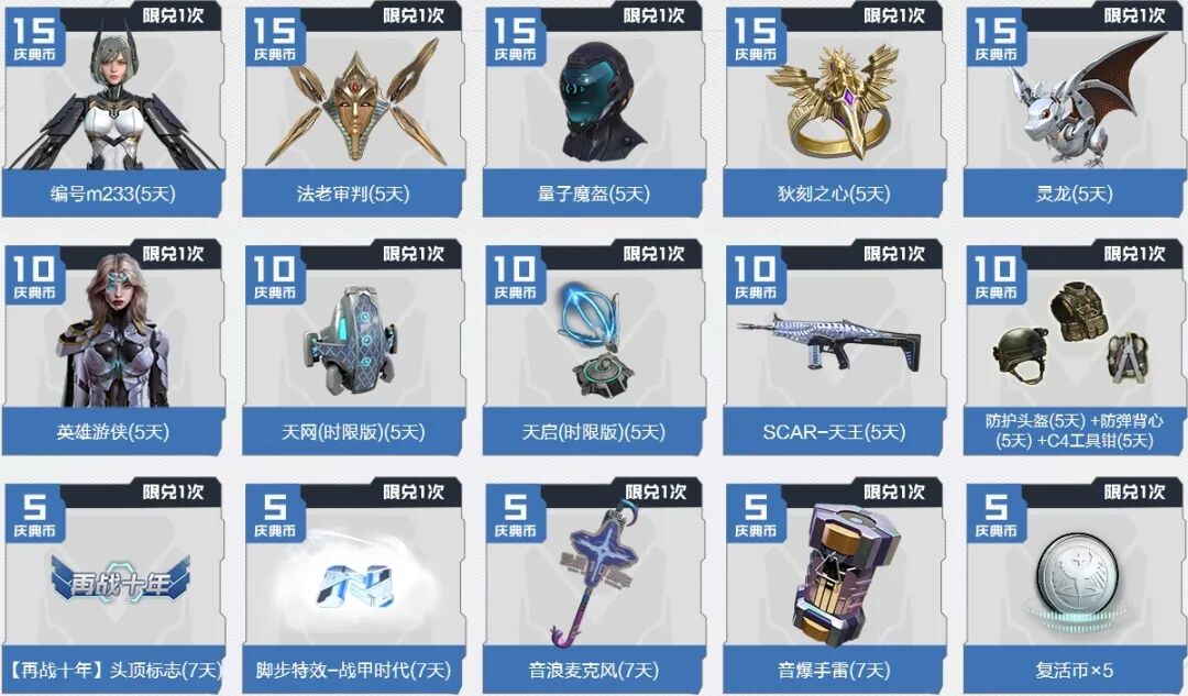 庆典币可用于兑换专属奖池奖励,极品道具可以限时解锁体验,包括编号m233(5天)、法老审判(5天)、量子魔盔(5天)、狄刻之心(5天)、灵龙(5天)、英雄游侠(5天)等极品道具。