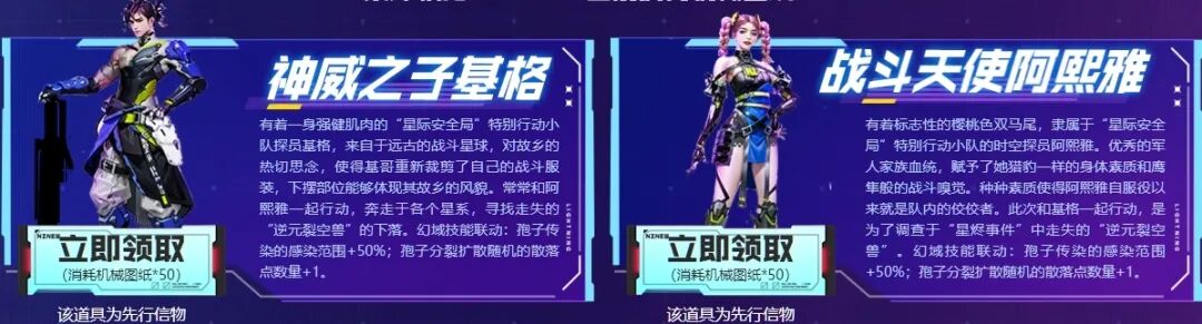 各位玩家消耗机械图纸*50即可兑换神威之子基格、战斗天使阿熙雅,他们拥有幻域技能联动:孢子传染的感染范围+50%;孢子分裂扩散随机的散落点数量+1。