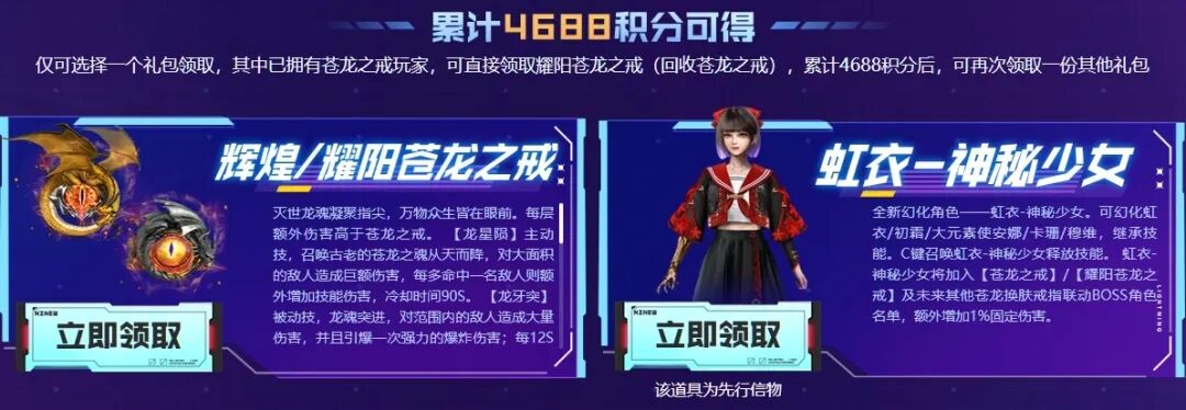 累计4688积分,可以在辉煌/耀阳苍龙之戒、虹衣-神秘少女中任选一件领取。如果已拥有苍龙之戒,可直接领取耀阳苍龙之戒(回收苍龙之戒),累计4688积分后,可再次领取一份其他礼包。