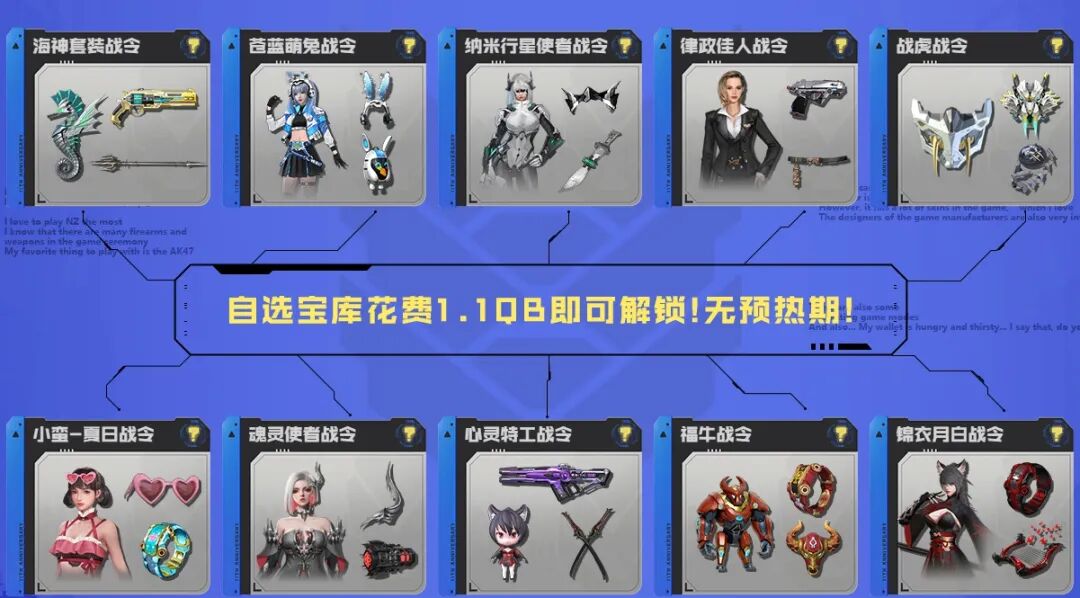 历年10套战令由各位玩家自选开启,第二战令同样可以使用18Q币解锁激战宝库,激战宝库奖励和青铜纪元战令宝库奖励一致。