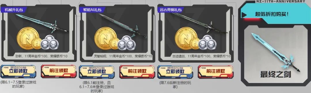 在活动期间,各位新老兵玩家,只要每日游戏60分钟,还可以领取11周年庆岁礼包,分别获得弥新、灵智铭钢、古迹遗剑、11周年金币、荣耀银币等奖励,还能以超低折扣购买最终之剑。