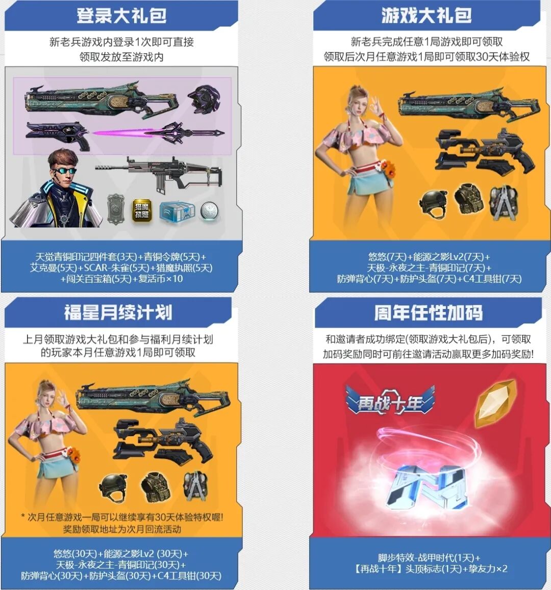 回归玩家还可以领取最强福利,登录大礼包、游戏大礼包、福星月续计划以及周年任性加码礼包,助力你轻松游戏启航。