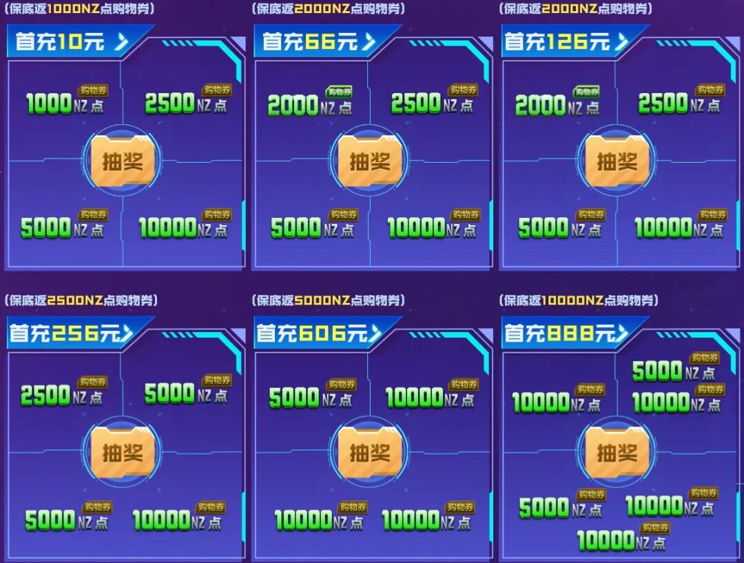 首次充值达到固定档位NZ点时,可进行首充抽奖,首充抽奖仅针对页面首笔充值有效。