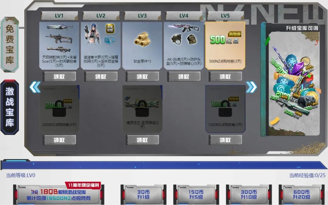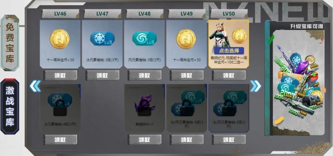 战令宝库升级至50级时,即可领取青铜纪元-琉茧或十一周年金币×188二选一。消耗Q币升级激战宝库,你还能获得更多奖励。