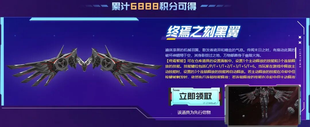 累计6888积分,即可领取终焉之刻黑翼,遍体漆黑的机械羽翼,散发着诡异和嗜血的气息。传闻末日之时,有扇动此翼的破坏神翱翔于空,其身影掠过之地,万物都葬身于幽暗火海。