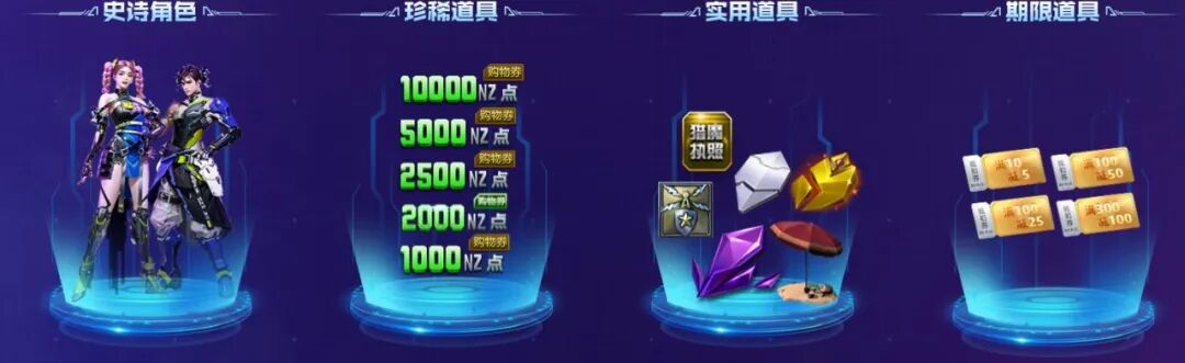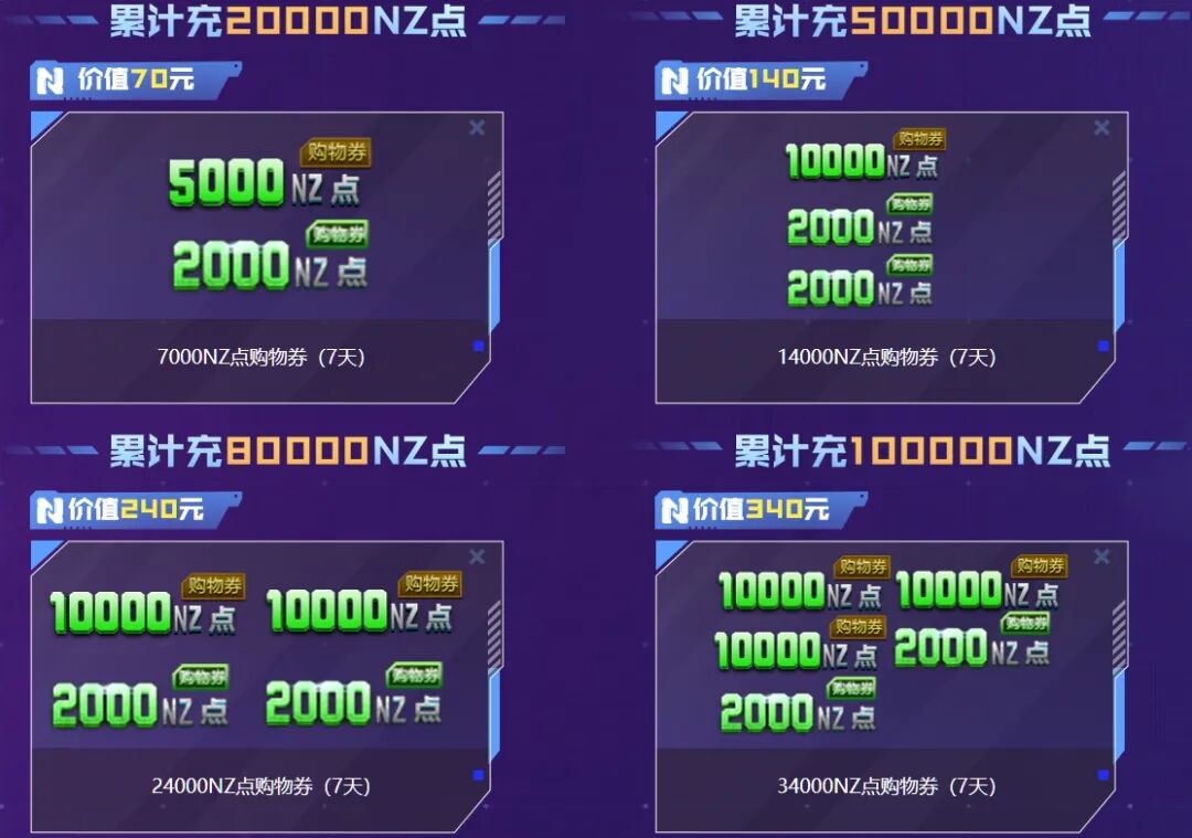 活动期间,玩家充值NZ点将以100:1的比例累积积分,累积不同阶段即可领取对应奖励。