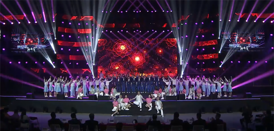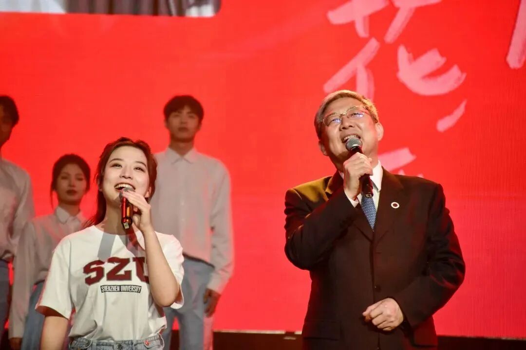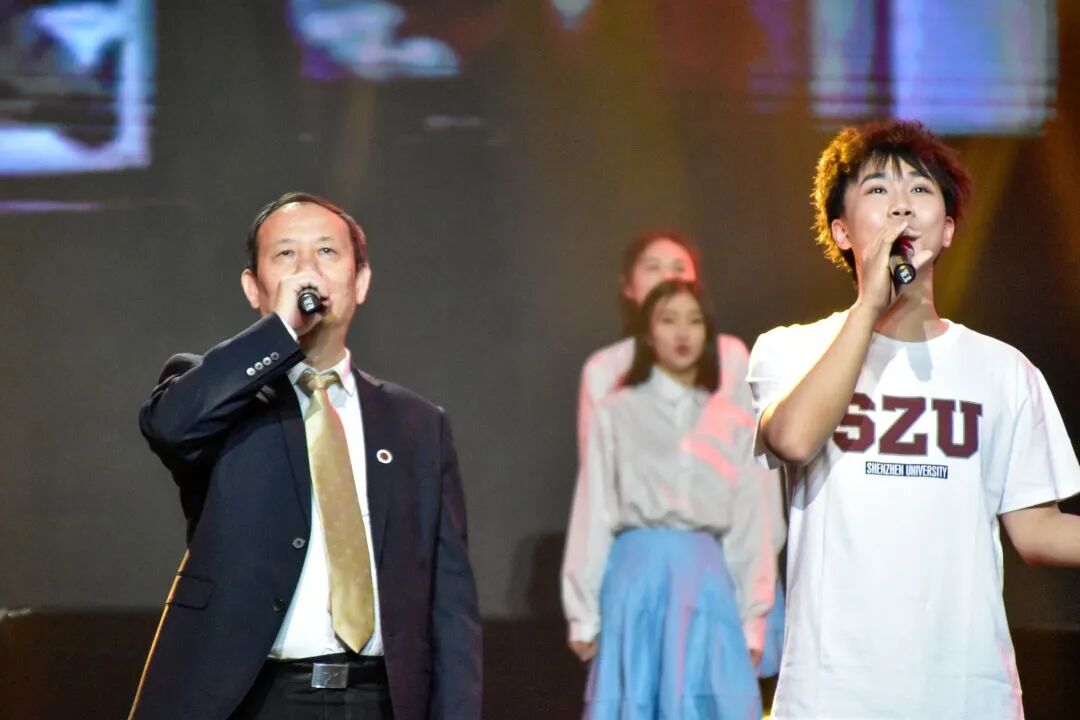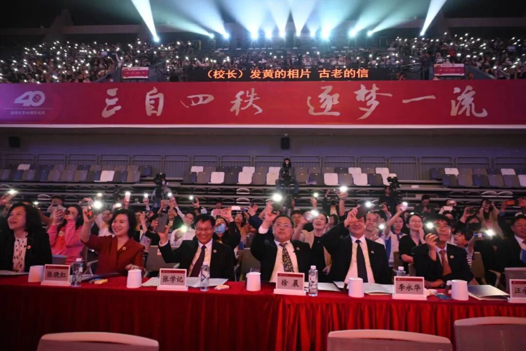 “流水它带走光阴的故事,改变了我们,就在那多愁善感而初次回忆的青春……”晚会最大的亮点当属合唱歌曲《光阴的故事》——深圳大学党委书记李清泉、校长毛军发与现场嘉宾、师生校友共同唱响深大四秩年华的朝暮与往昔,将晚会气氛推向高潮。摇动的手机灯光如同夜空繁星,动人的场景浓缩着爱意,现场师生和校友情不自禁加入合唱,青春的旋律响彻荔园。