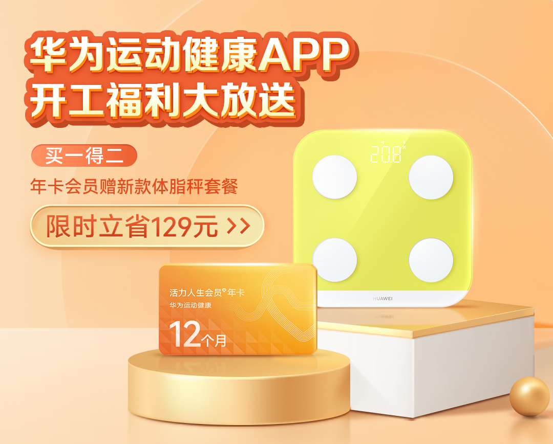 现在购买活力人生会员年卡,不仅可以享受精品课程、智能减脂、助眠音乐、营养分析等10大尊享会员权益,还可获得价值129元的新款华为智能体脂秤3(蓝牙版)。
