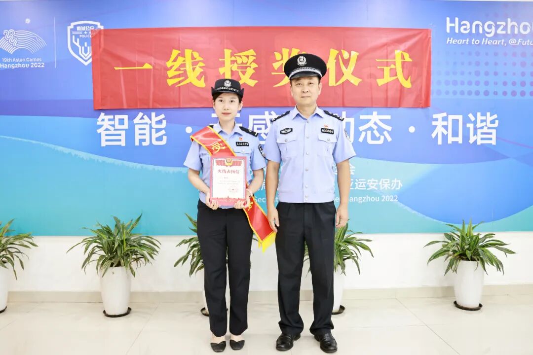 9月4日,杭州市公安局机关党委专职副书记汪奴戟赴位于拱墅区的杭州体育馆,为在平安护航亚运工作成绩突出、获得省厅通报表扬和荣立个人三等功的江瀚、金天红、王建波3名同志送奖到岗,颁发表扬信和奖励证书、奖章。