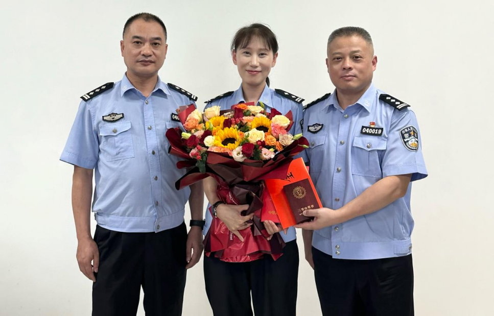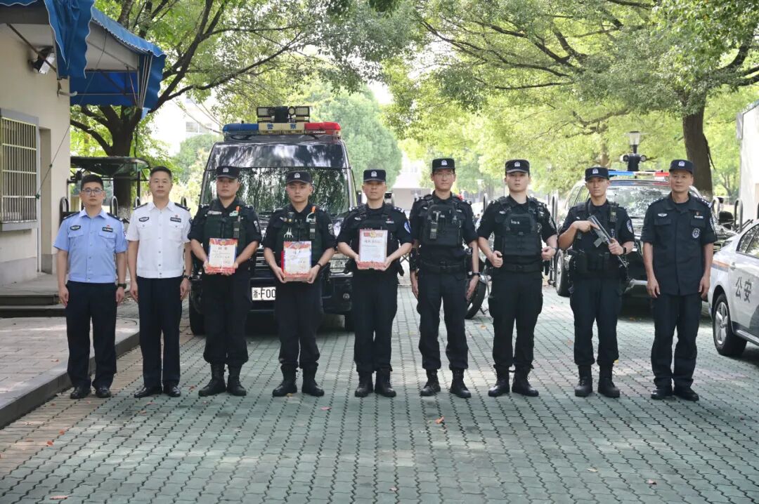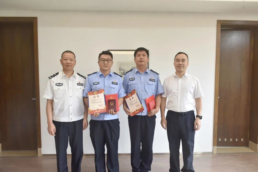 9月1日,杭州市公安局警务处处长王擎坤赴滨江区公安分局,为在平安护航亚运工作成绩突出、获得省厅通报表扬和荣立个人三等功的俞韬、虞烽波、李静君3名同志送奖到岗,颁发表扬信和奖励证书、奖章。