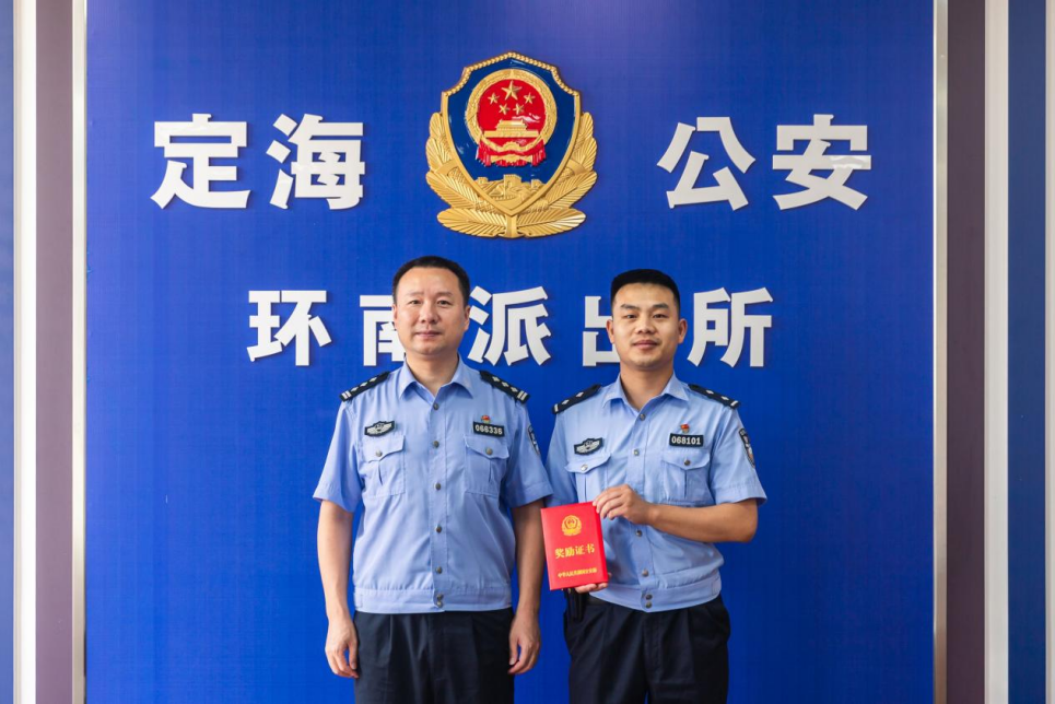 9月5日上午,舟山市公安局定海区分局党委委员、政治处主任俞凯为荣获嘉奖的环南派出所民警戴志男送奖上门,颁发证书。
