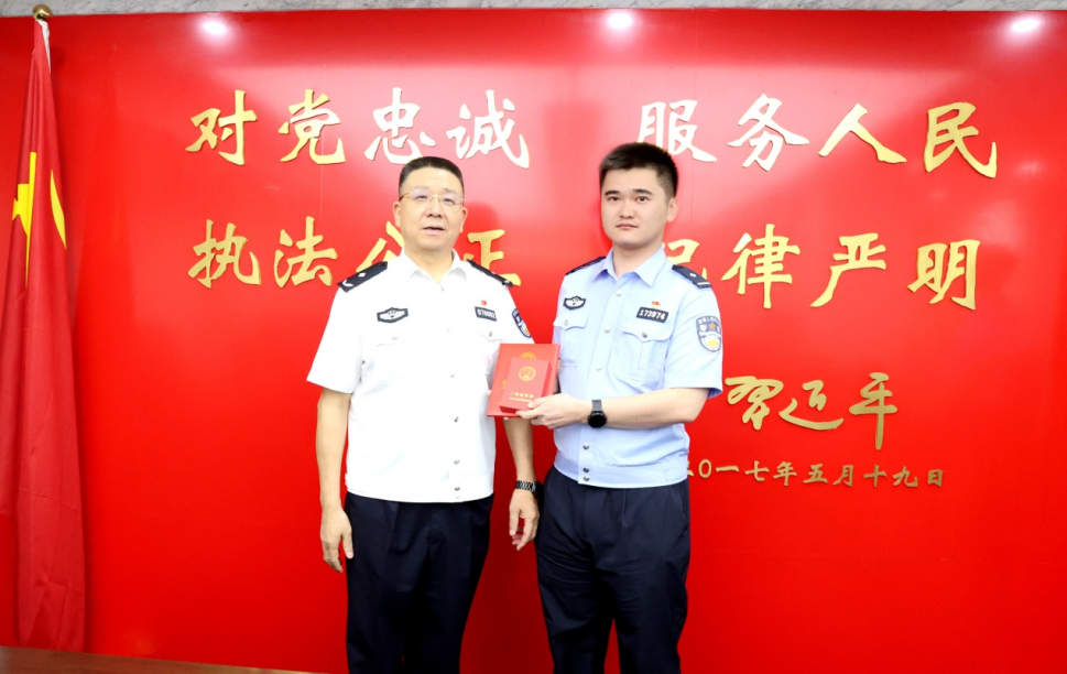 8月21日,金华市公安局党委委员刘梦寒为荣立个人三等功的民警祝俊攀颁发奖章与证书。