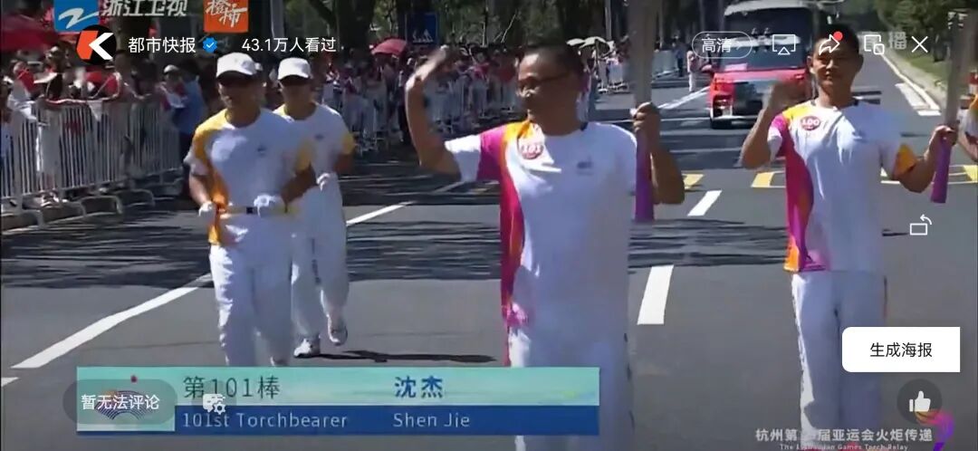 “当选杭州亚运会火炬手,并完成湖州市域1/170的火炬路线传递,这是一份荣耀,更是一份责任。作为火炬手,传递火炬,传递的是‘更快、更高、更强’的奥林匹克精神;作为公安民警,传递火炬,代表的是我们湖州公安民警守护火炬、守护亚运的‘必胜’决心。”