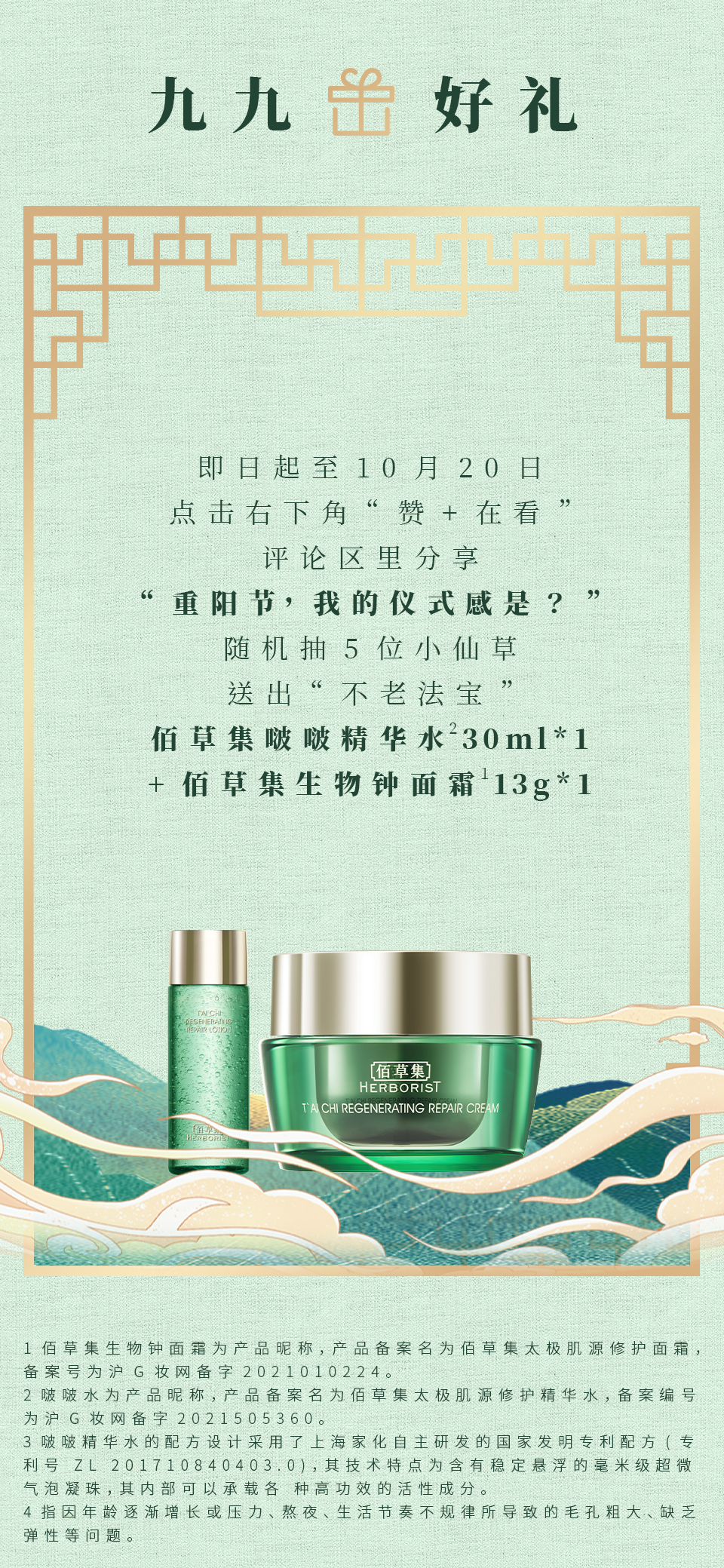 推荐:「点击展开」重阳节的一些不老线索,借此和护肤品的不老效果相结合宣传佰草集的水乳,吸引大家领取九九好礼。
