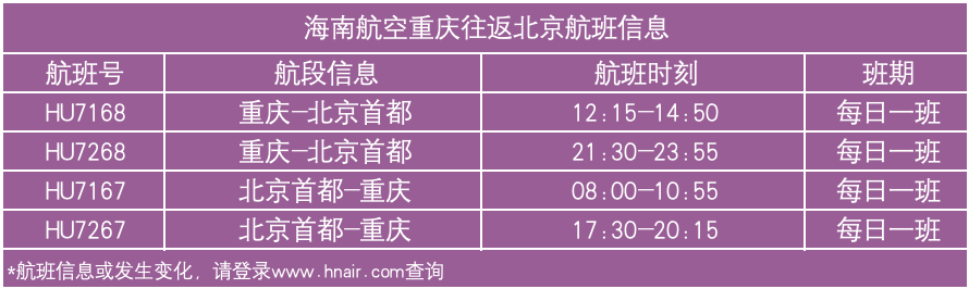海南航空还提供北京往返重庆直飞航班