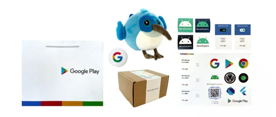 * 开发者定制礼包: Android 贴纸和镜头贴、Google Play 旅行套件、Flutter Dash 玩偶、Google 胸针、谷歌开发者贴纸