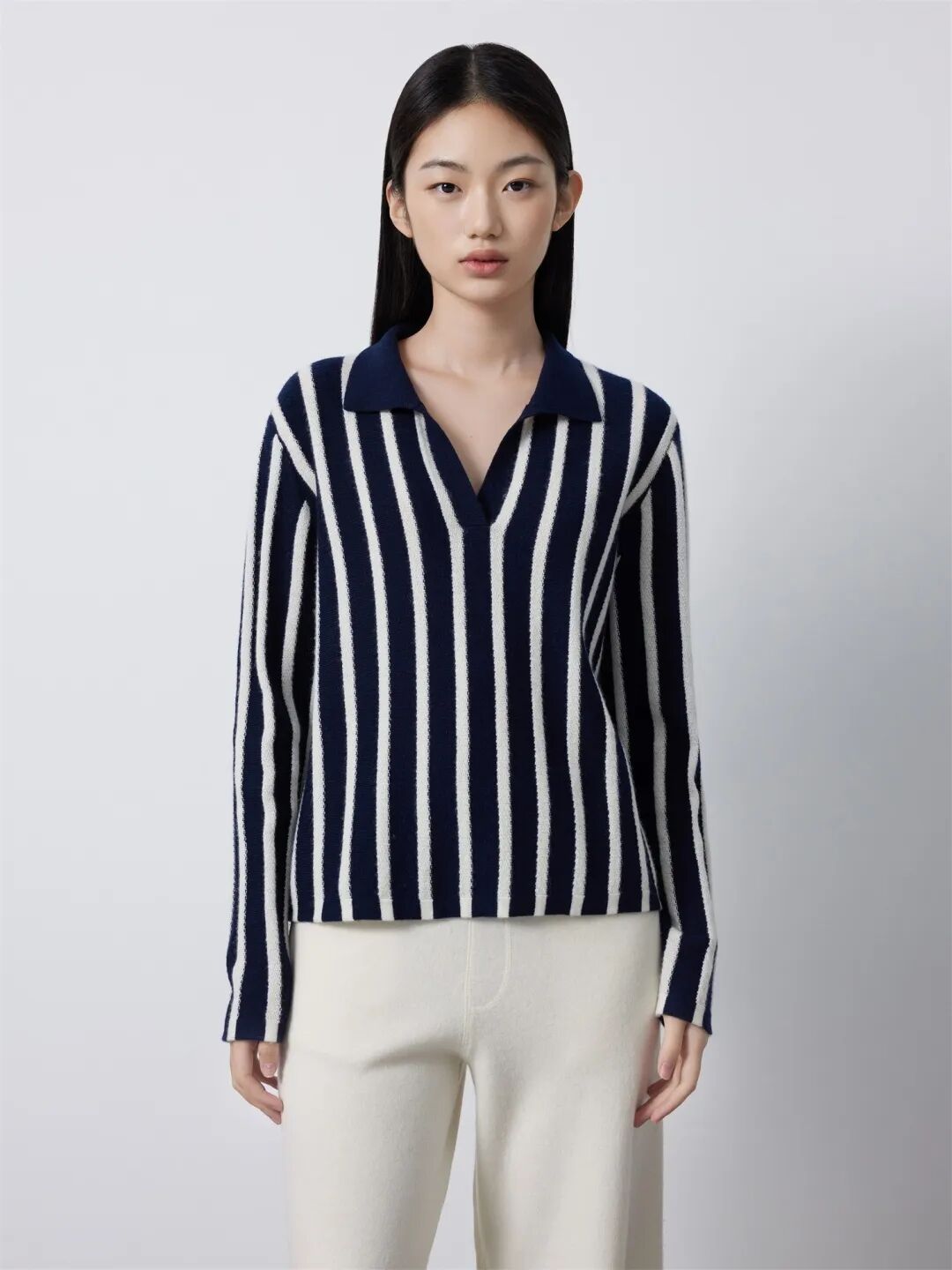 ▲小翻领夹条翻花套衫¥2690,折后价¥2555