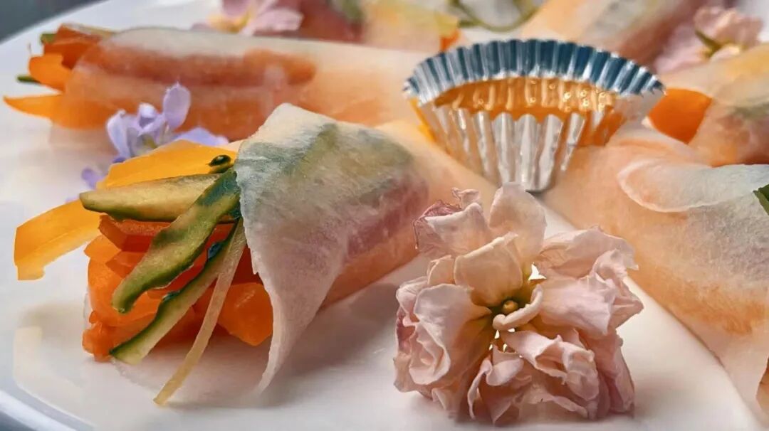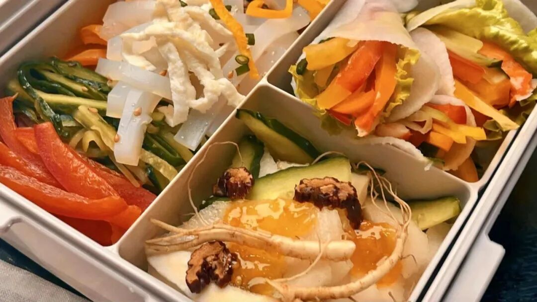 3. 白萝卜片上放黄瓜,彩椒,蟹肉棒,苹果卷起来