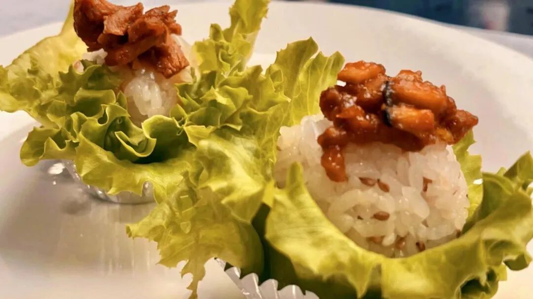 4. 准备生菜里面放米饭上放好猪肉酱包起来