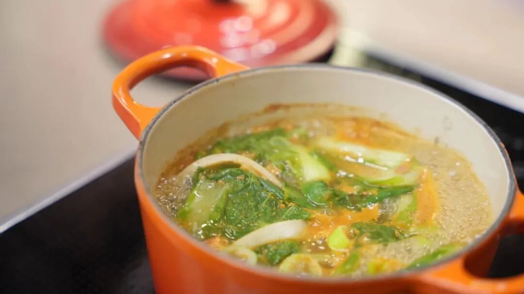 4. 鳀鱼肉汤里放大酱汤调味酱,辣椒粉,小航白菜,煮开了放入蒜泥和大葱