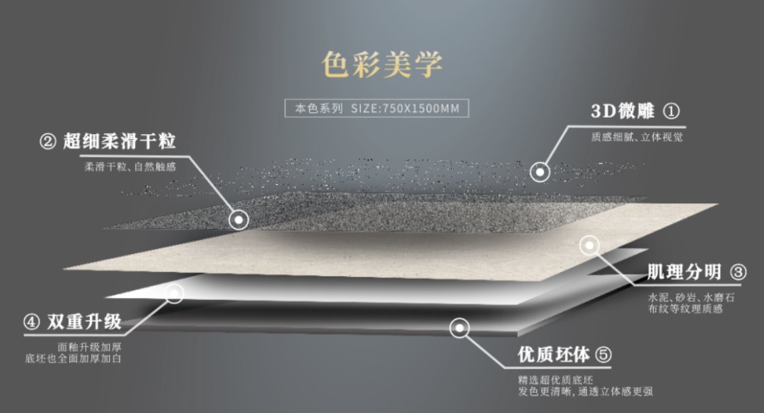将各类材料的基础颜色、质感通过瓷砖的产品设计和复合工艺实现在瓷砖表面的综合效果,以独特的空间美学应用,引领瓷砖色彩美学领域的风向,让当代消费者享受质美生活。