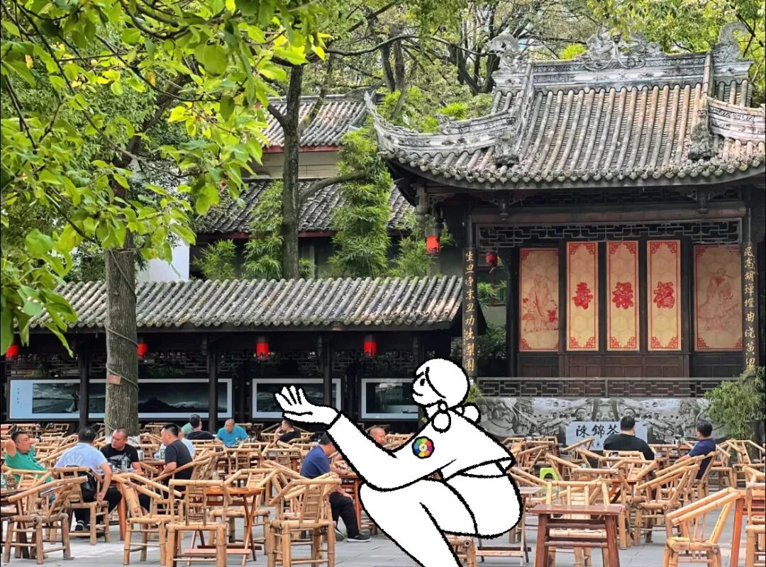 坐在戏台前的茶馆里喝茶、“摆龙门阵”