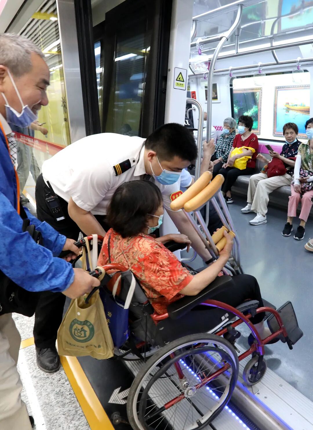 一对老夫妻乘坐无障碍电梯至站台,准备乘5号线去太湖边转转,但在上车那一刻却犯了难,由于轮椅太重,一人难以将其提起,车站员工看到后立马主动上前帮助他们一起将轮椅抬上车,并细心地提醒他们在乘车时注意安全。