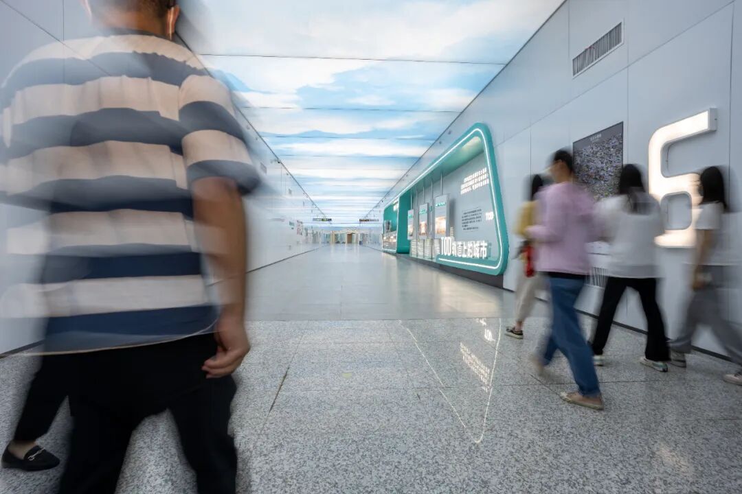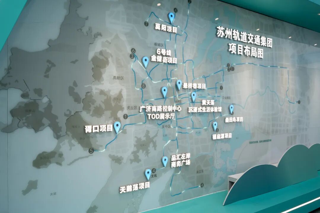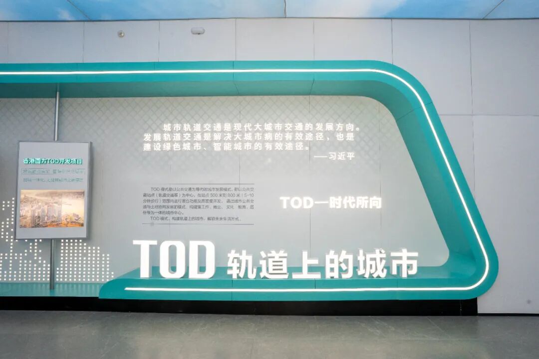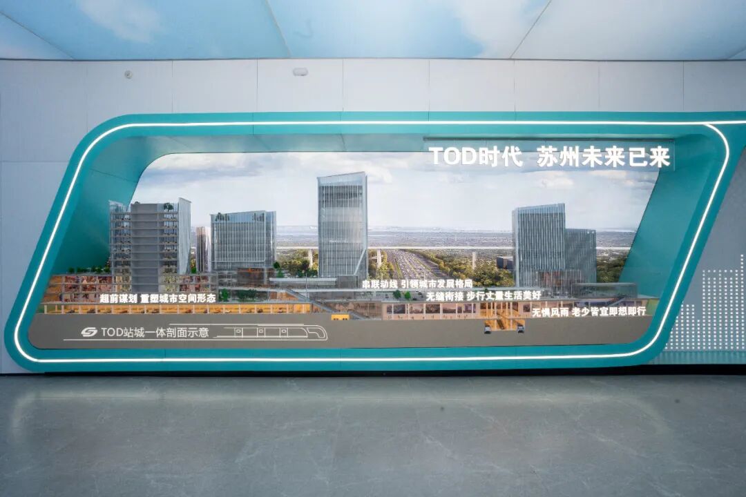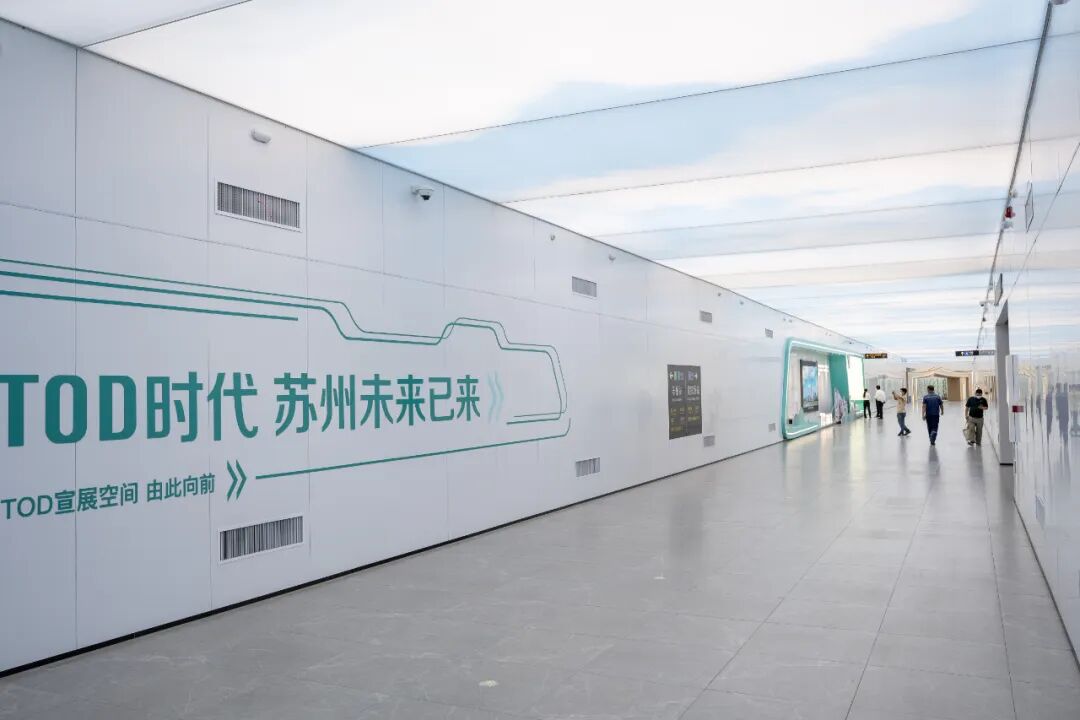 苏州轨道交通顺应城市土地综合开发的新形势,在该通道特别布置了苏州首个TOD展示中心,通过立体场景模型、概念短片、互动空间等形式,多角度介绍桑田岛、品汇左岸商务广场等苏州轨道交通TOD开发项目及模式,多维度诠释TOD时代下的苏式生活,让市民沉浸式感受TOD生活的便利。