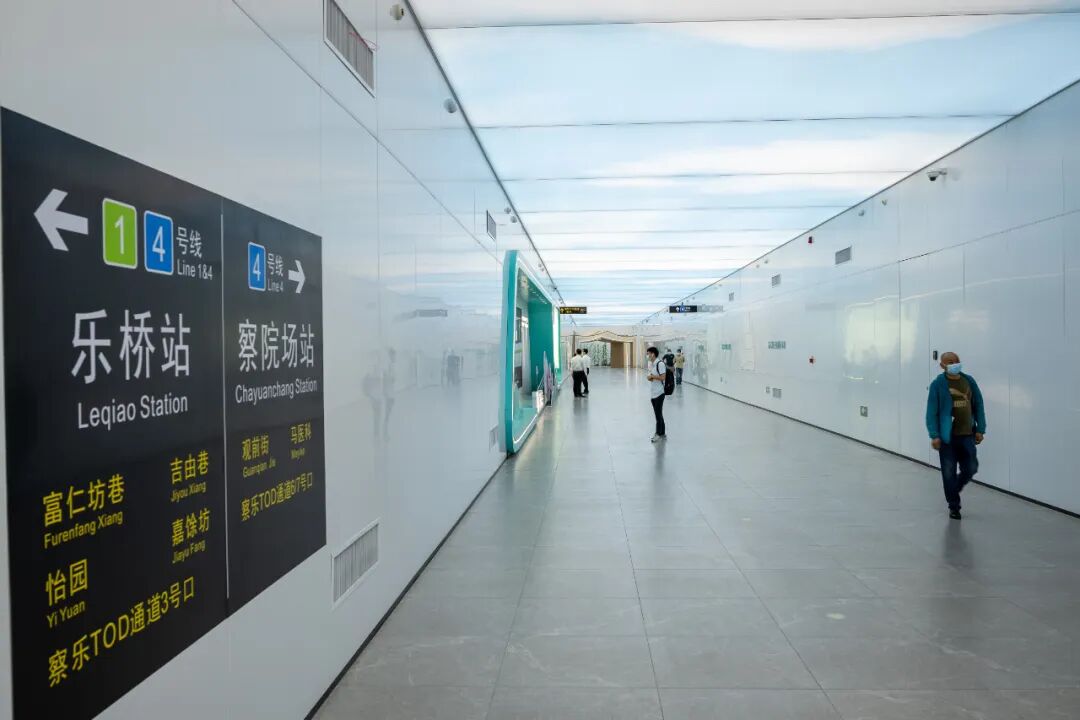 察乐TOD通道,位于古城核心C位,毗邻周边多个商场。以往乘坐1号线前往观前街的市民,或通过地铁换乘,或需要地面步行,出行效率或体验均不够理想。该通道开放后,市民便可远离车水马龙的喧嚣,免除风雨暴晒的烦恼,步行5分钟即可从乐桥直达观前核心圈,该通道四个出入口也同时开放,方便市民快速抵达周边街巷、商场。察乐TOD通道将绿色环保理念融入整体建筑装修,顺应绿色低碳发展潮流,选择可循环利用的装配式材料,十分节能环保,这也是在苏州轨道交通在装配式建筑领域的积极探索实践。