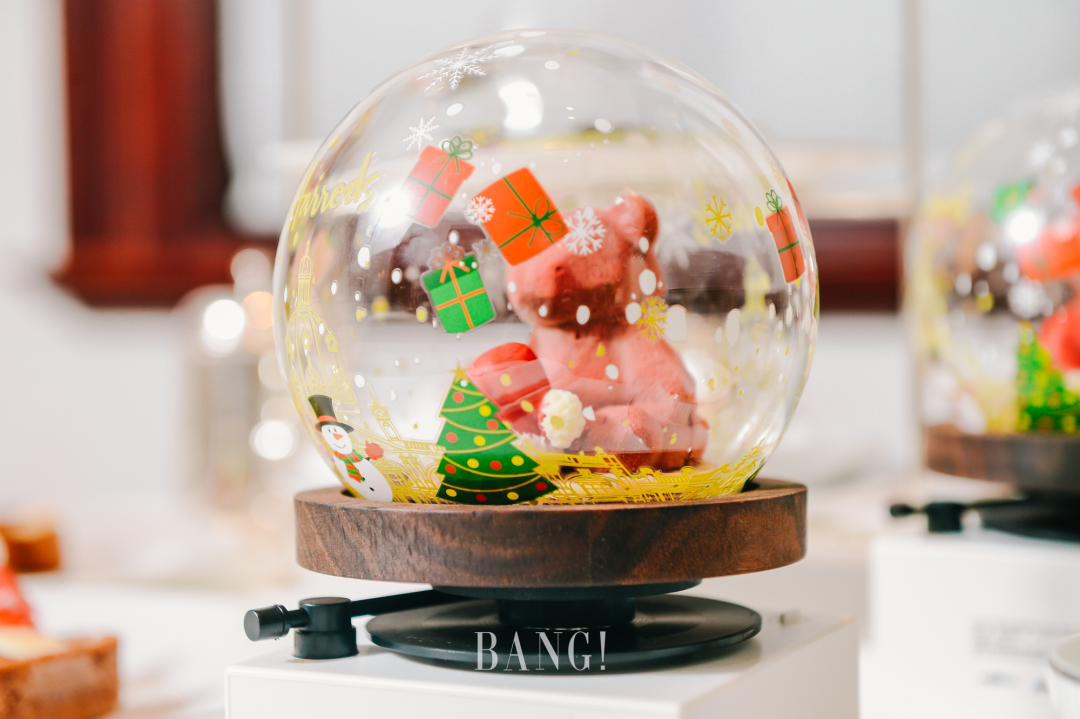更有超可爱的圣诞熊造型甜品,放置在八音盒中,随着动听的音乐旋转起来,直接击中了我们的少女心。打开八音盒后,巧克力慕斯和杏仁海绵蛋糕的搭配,再加上樱桃酱,每吃一口都能感受到混合在一起的甜香。