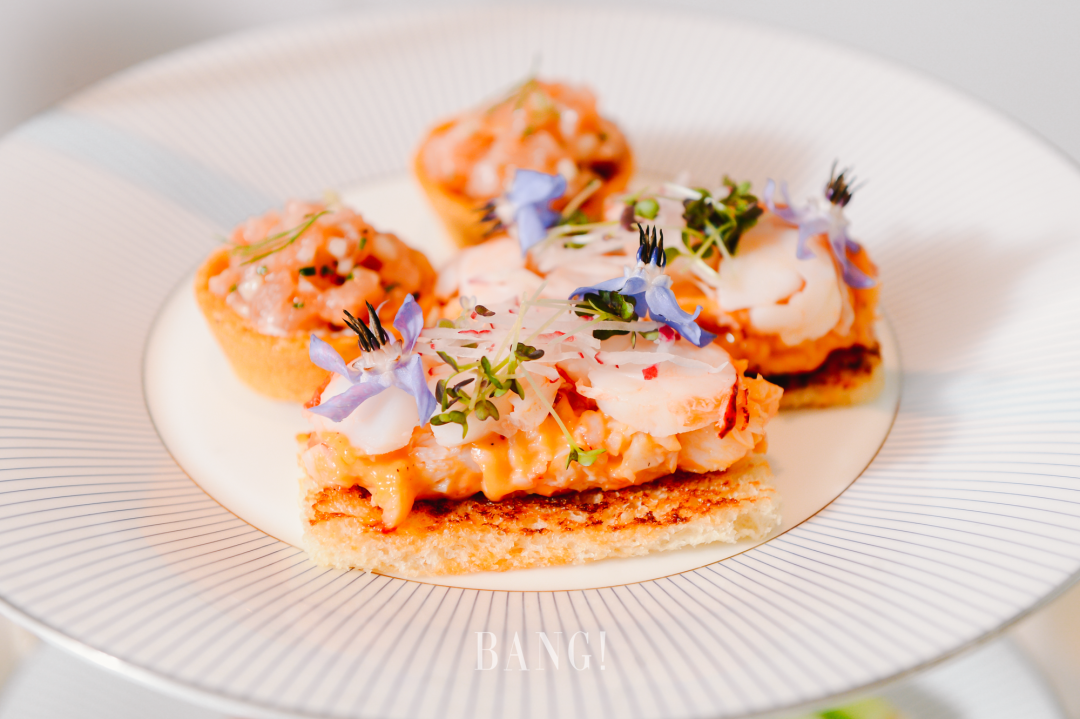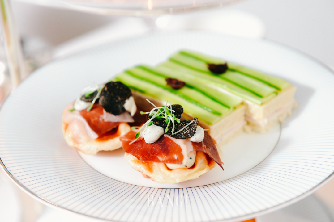 三层塔茶点刚端上来就吸引了我们的目光,蔓越莓奶油芝士搭配火鸡胸肉,咸鲜口感中带着一些清新的气息;龙虾&虎虾卷配樱桃萝卜和荠菜苗颜值非常能打,虾肉和樱桃萝卜带来双重口感的碰撞;烟熏三文鱼放置在青苹果迷你塔中更显可口;在可颂华夫饼上放置松露布里干酪和5J火腿,吃起来满嘴鲜香。哈罗德茶室更是推出了4款圣诞限定糕点,将肉桂焦糖饼干和热红酒果冻以及柑橘慕斯一起做成圣诞帽,把栗子慕斯、曲奇、橙花奶油和黑醋栗啫喱化为礼盒的模样,更有4种风味蛋糕搭配梨子啫喱做成的圣诞姜饼,每一款都是不容错过的甜点。