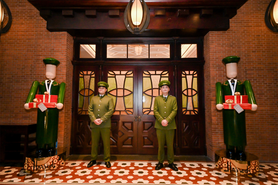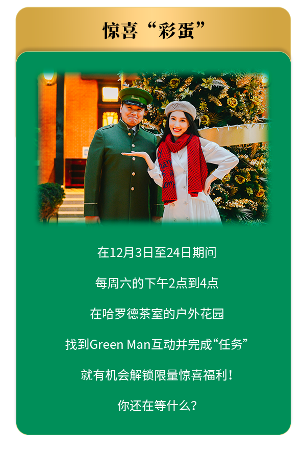 门口身穿绿色制服的Green Man正在迎接着我们的到来,准备好了吗?门后等待我们的将是一场浪漫圣诞之旅。作为英国伦敦哈罗德百货在中国的首家茶室,我们可以在哈罗德茶室感受到英伦情怀与上海风情碰撞出的“火花”。