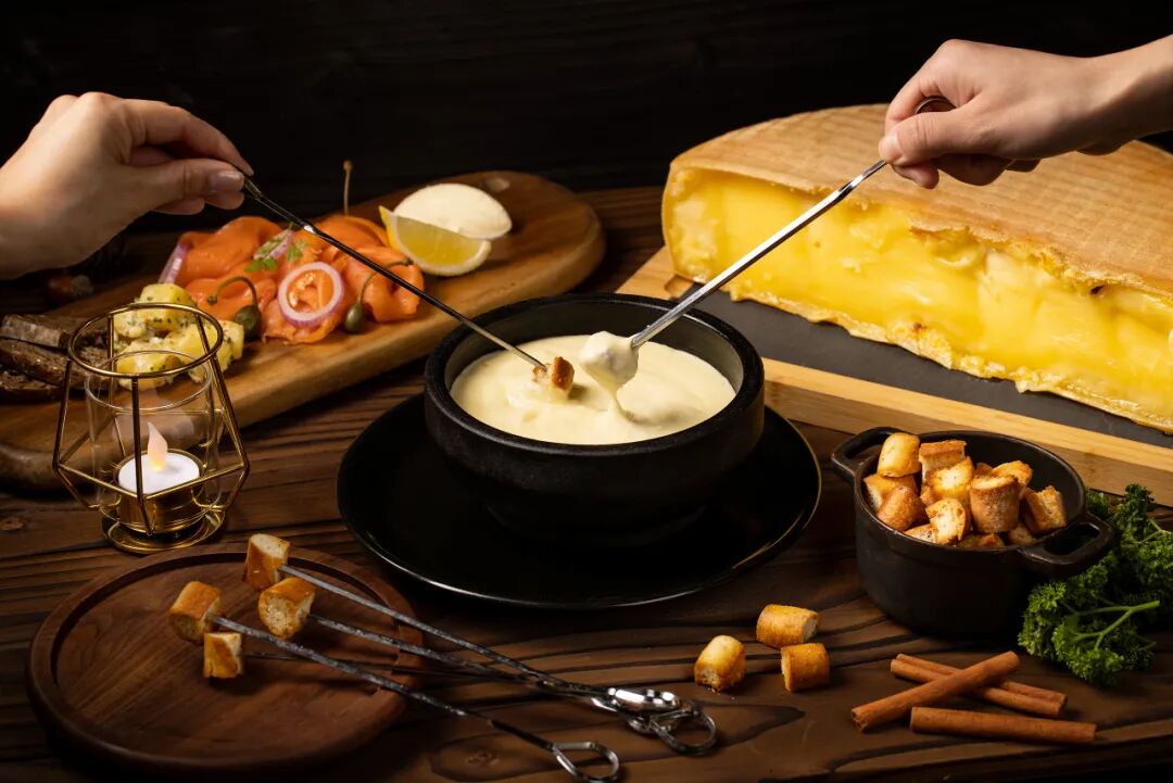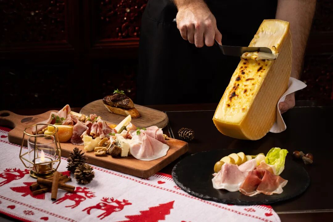 正宗的瑞士拉克莱特奶酪、奶酪火锅、阿尔卑斯芝士和冷盘、黑松露披萨、传统火腿和精选香肠、圣诞布丁以及栗子蛋白奶油蛋糕......
