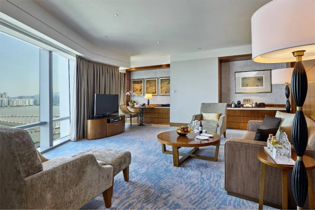 酒店里部分房间有面向南湾湖的落地窗,白日阳光下的山湖旷达,夜晚对岸边的灯火璀璨,是能治愈所有疲惫的礼物。