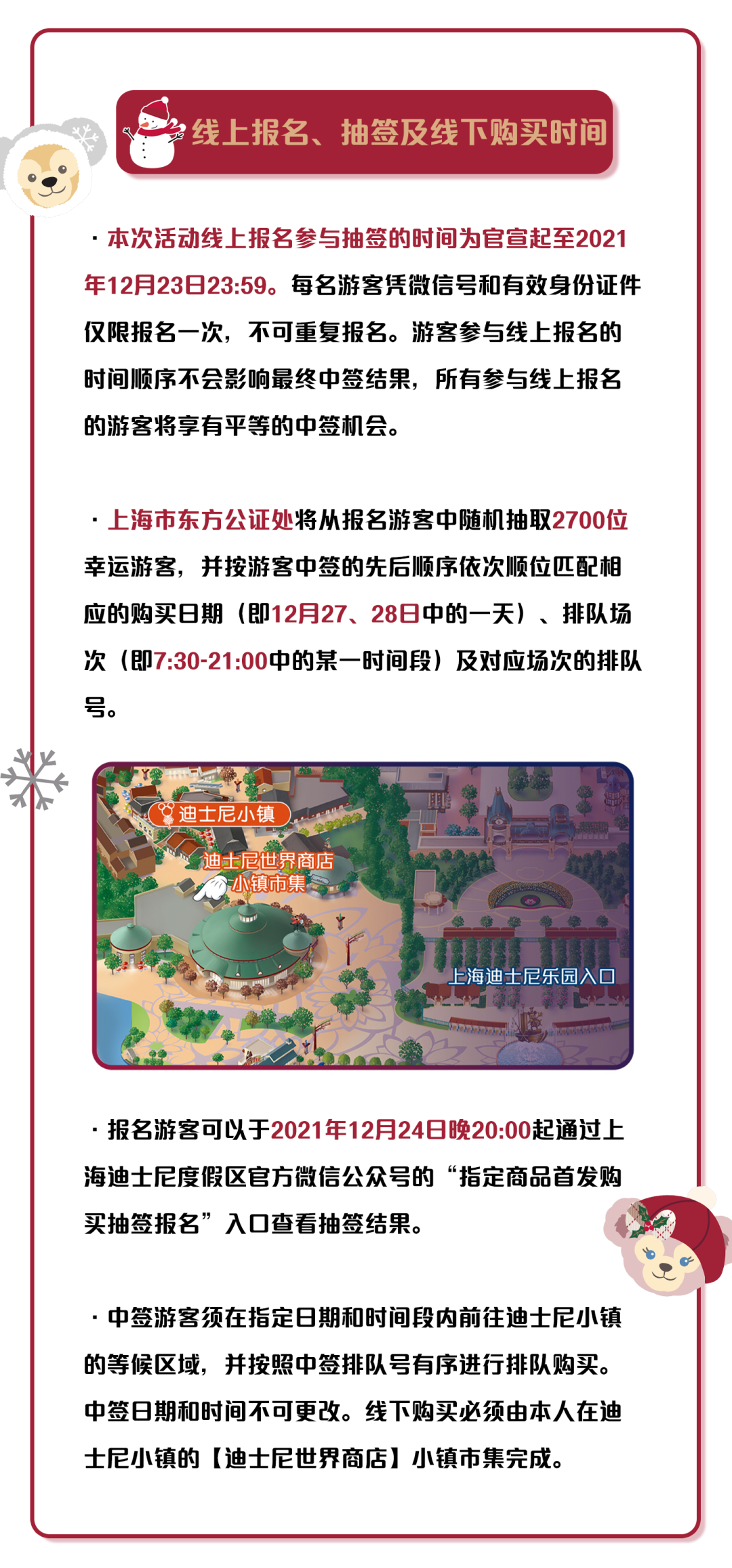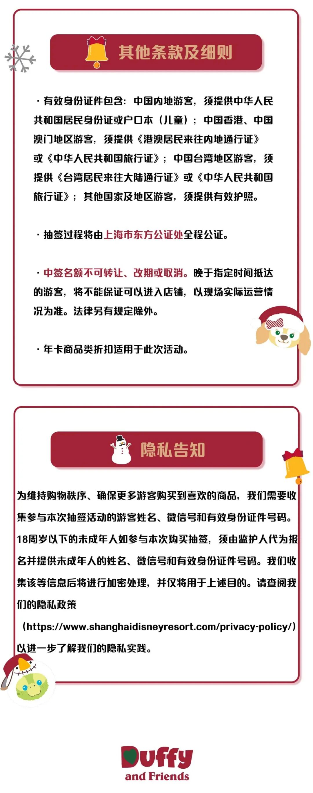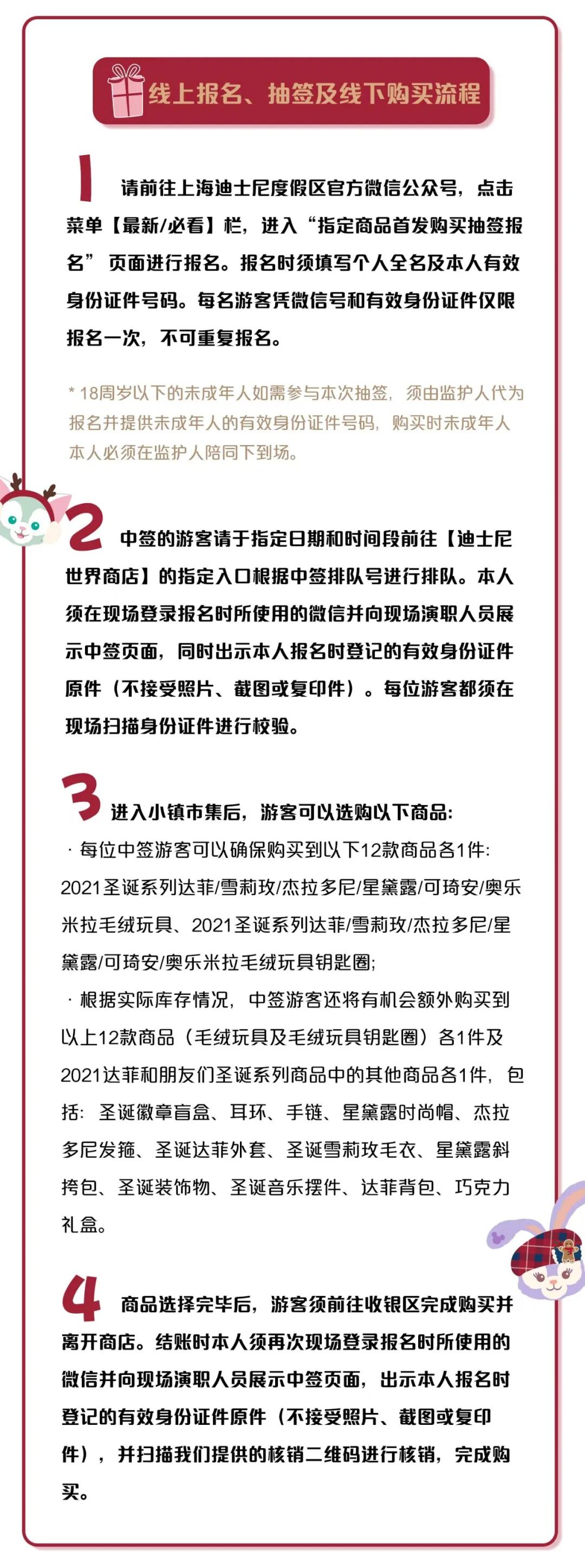 我们认真聆听了游客的反馈,并在最近进行的线上预约+线下购买玲娜贝儿主题商品的过程中汲取了更多经验。基于以上经验以及上海最新的疫情防控要求,同时在相关政府部门的指导下,我们在此与大家分享更新的【2021达菲和朋友们圣诞系列商品】(玲娜贝儿主题商品除外)的发售方式。新的发售方式将遵循提前线上报名、抽签以及限时线下购买的方式。抽签过程将由上海市东方公证处全程公证。