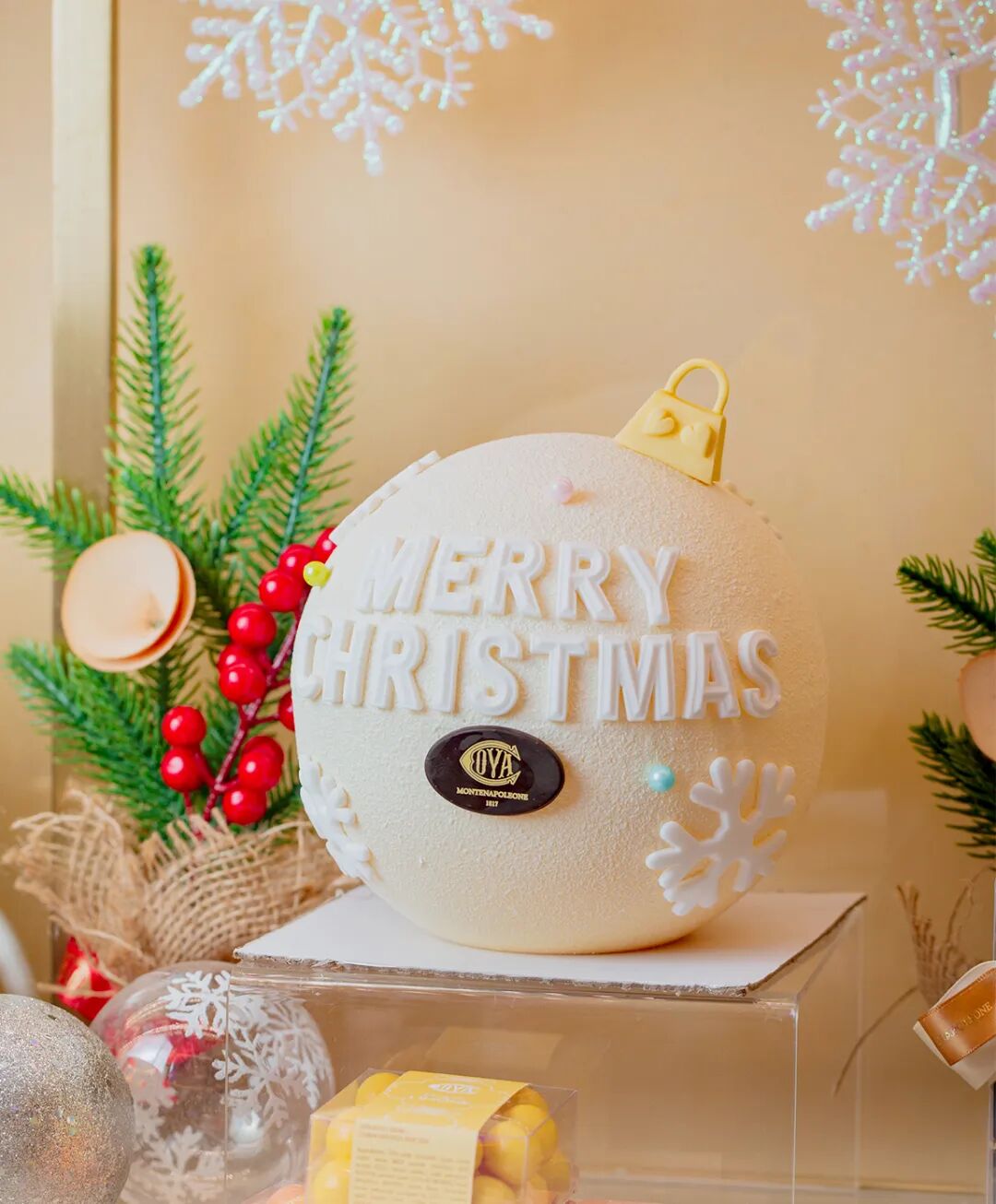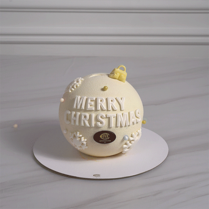 经典芒果鲜奶油蛋糕变身圣诞彩球,超高颜值让人一眼就心动!翻糖雪花、礼盒妆点了彩球四周,圣诞氛围瞬间拉满!