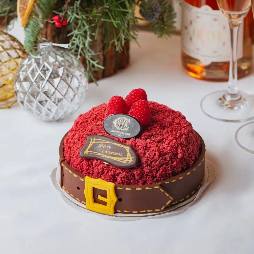 围着圣诞老人腰带的树莓蛋糕,表面被覆盖了一层红色天鹅绒海绵蛋糕颗粒,圆润的造型十分惹人喜爱。