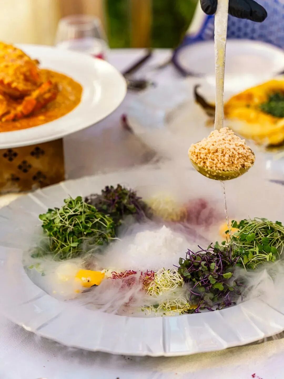 以零下180度液氮制作出的法式鹅肝,搭配6款时令有机芽苗制作的地球沙拉配雪花鹅肝,在缤纷的视觉呈现外,用酸甜爽脆的口感,开启味蕾体验。
