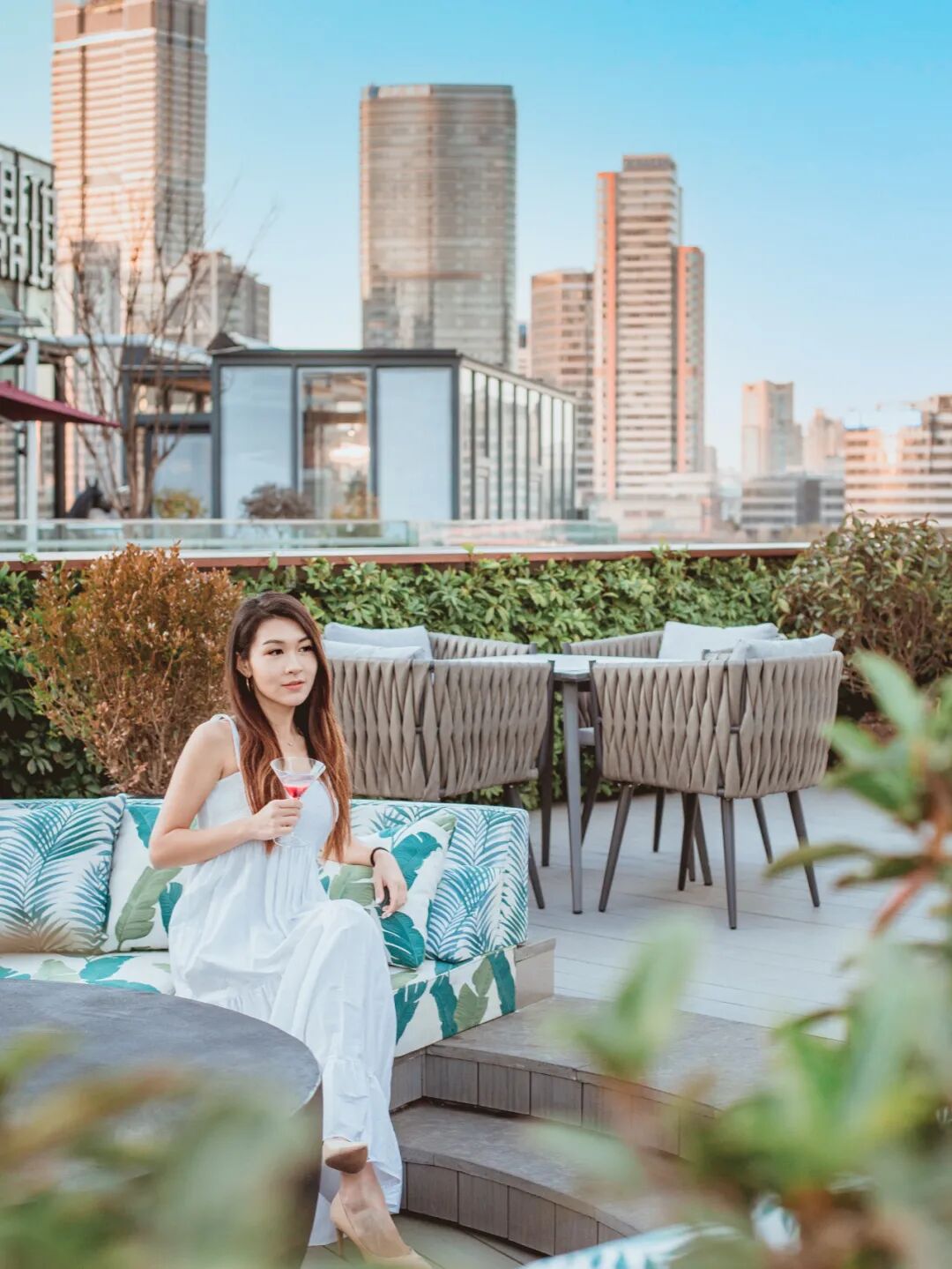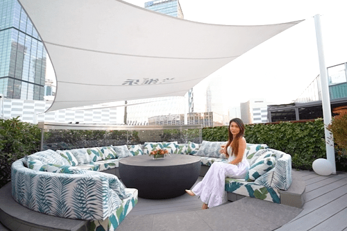 在建筑的三楼,还藏着一个视野超美的屋顶露台。纯白色帐幕与原木元素,营造出轻松的度假氛围,在摩天大楼的衬托下显得格外别致~