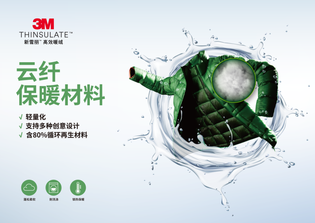 2022年全新推出的3M™新雪丽™云纤保暖材料是一款新型Featherless保暖材料,具有高保暖、轻量化的优异特性,含有80%循环再生环保材料,且采用全新加工工艺,优化产品加工流程,从原料和能源双向入手降低产品生命周期中的碳排放。