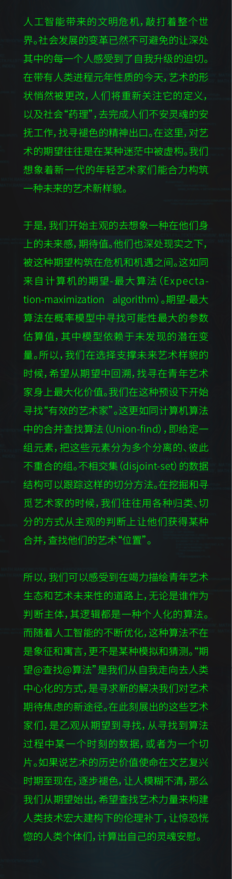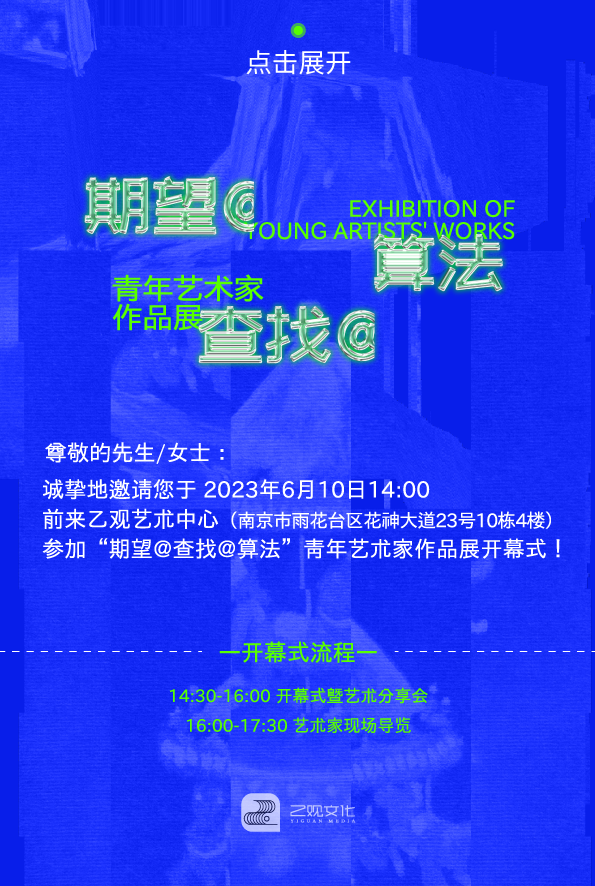 2023年6月10日,乙观艺术中心重磅推出“期望@查找@算法”青年艺术家作品展。展览由独立策展人、艺术批评学者宋振熙策展,南京艺术学院美术馆副馆长林书传担任学术主持,在勾勒艺术领域“Z时代”画像的同时,带领观众一窥未来艺术的生长雏形。