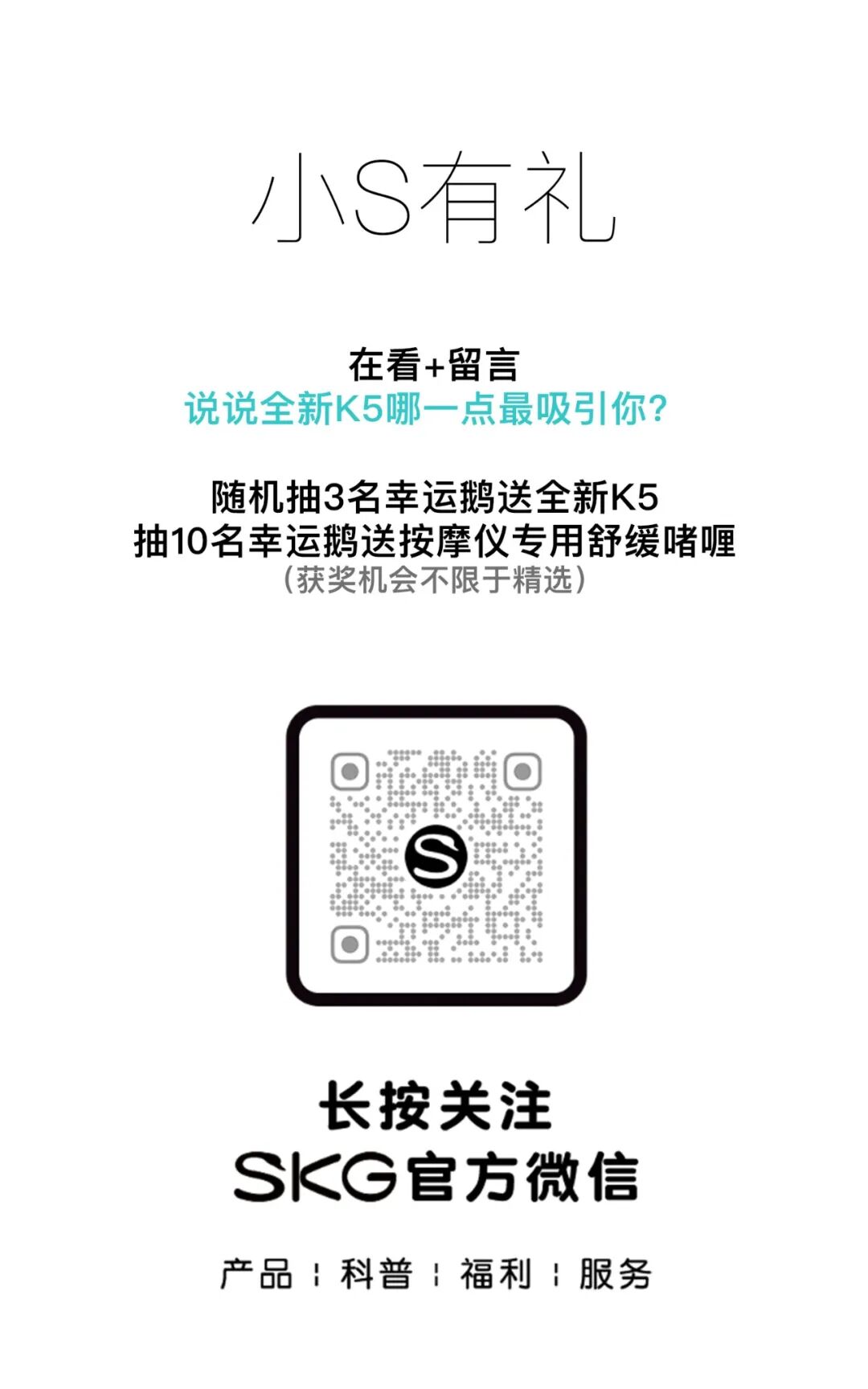 1全新K5纤巧面世,听说是个护颈高手。想要细腻“手法”、赶走酸痛?现在,通通交给它。2外观。颜值有料,身材苗条。“Ω”流线设计,颠覆传统造型。白银撞色,质感出色。不足95克,酸痛攻无不克。图片标注:*荣获设计界红点/IF双项奖的颈椎按摩仪3分区按摩。“手法”细腻,超感舒适。四大分区交替联动,灵巧仿若人手按摩。按压/揉捏/捶打/综合四重模式,强弱皆适。深厚内力,迸发澎湃功力。双脉冲按摩,1000种按摩波形变化,让你的每根神经都酥酥麻麻,从神经、到血管、到肌肉3层放松。4大面积热敷。安心享受,温暖无需等候。嘿,面状加热来了,热敷更大更全更满足。3秒速热、3档温控,高效舒缓,锁定温暖。5更多惊喜。钻石纹滚轮按键开关、档位、力度调节三键合一,一按一滑,畅爽无阻。6APP+小程序智能双控除了小程序,还有全副武装的APP。个性化匹配更多按摩模式,电量查询、护颈知识等等,有你想要,更有意想不到。7现在就预定你的护颈高手。全新K5 首发专享价539。8月1日-20日,1元预定立省160,更多惊喜等你发掘小S有礼在看+留言说说全新K5哪一点最吸引你?随机抽3名幸运鹅送全新K5抽10名幸运鹅送按摩仪专用舒缓啫喱(获奖机会不限于精选)