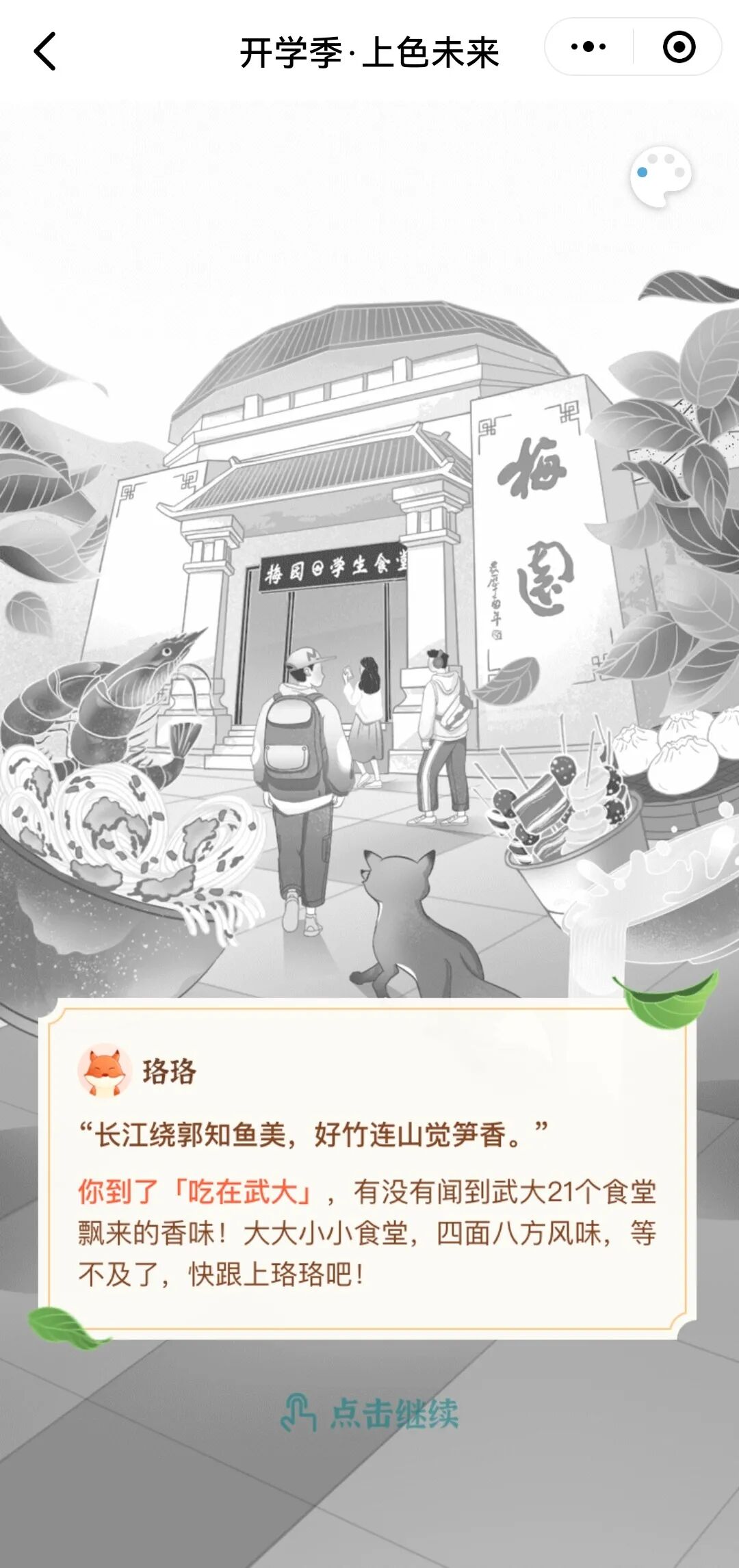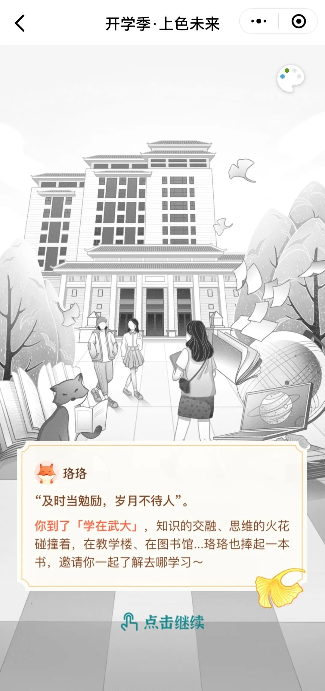 为了让珞珈山的新主人们能够顺利适应学校环境,校园导览小程序这次专门开发了一个趣味横生的小活动,即“上色未来”。