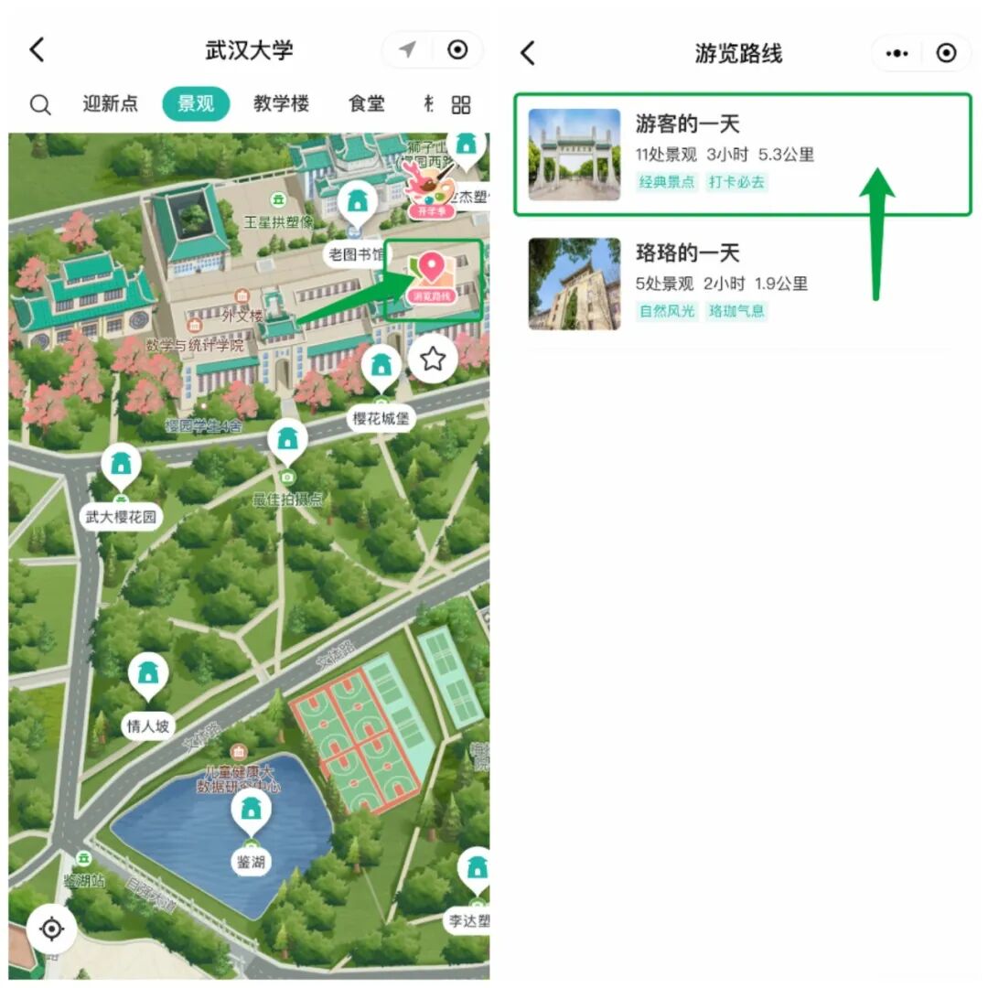 刚来武大的你,如果想要探索武大的景点,可不要错过游览路线功能,点击主页右侧的游览路线,开始一段奇妙的探索吧!