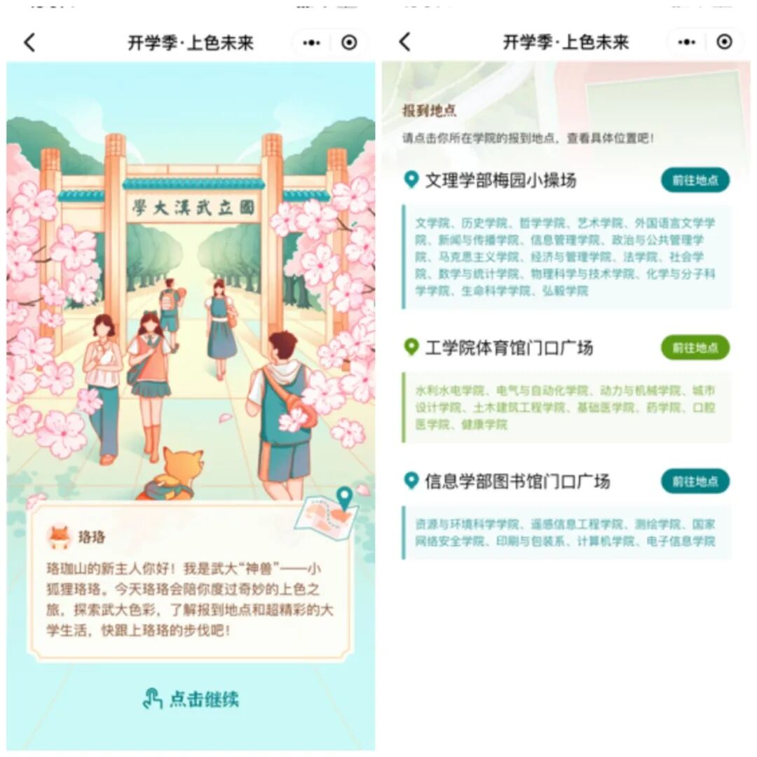 在这个活动中,你可以在校园导览小程序里线上探索武汉大学,获得不同的颜料,为灰色的校园场景注入特别的颜色,跟随珞珞一起,提前了解报到信息及吃、住、学、玩等各个环节的相关介绍呢。