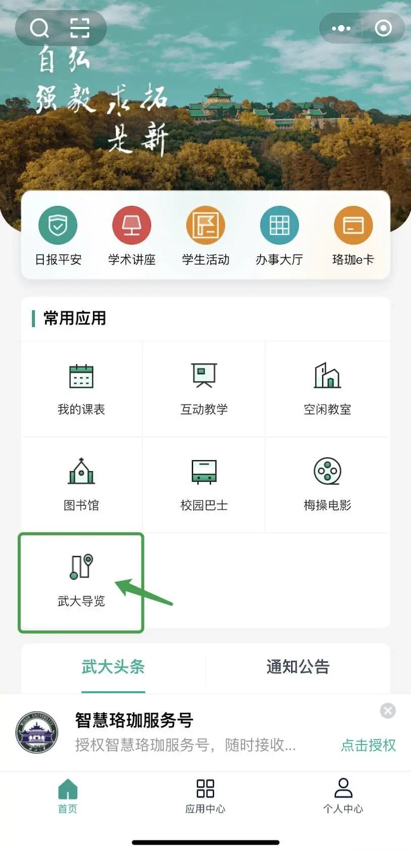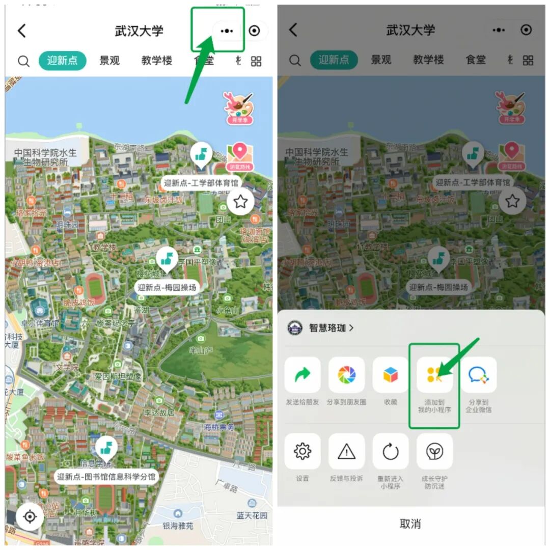 1. 建议把「智慧珞珈」校园导览小程序添加到常用收藏中,便于及时查看地点。