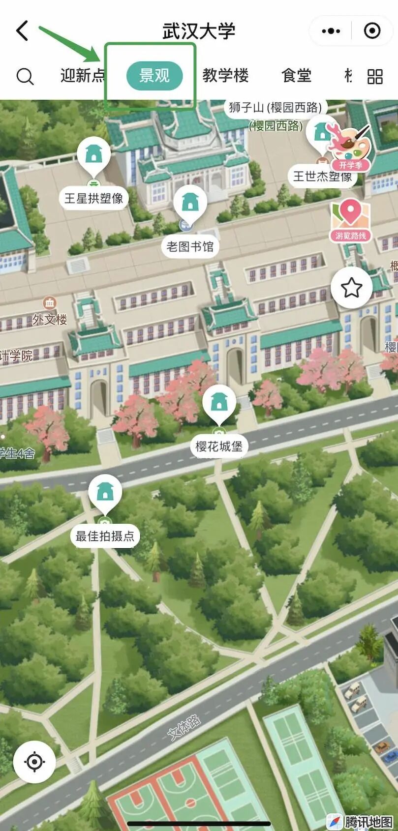 比如,如果想找到武大最有名的樱花城堡,可点击“景观”分类,再放大查找: