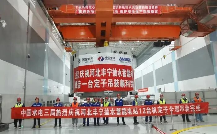 7月15日,由中国电建参与建设的国家电网河北丰宁抽水蓄能电站11号机组定子成功吊装,标志着丰宁抽蓄电站全部12台机组定子全部吊装完成,为年底实现首台变速机组投产发电奠定了基础。丰宁抽水蓄能电站共安装12台300兆瓦单级可逆式水泵水轮发电机组,总装机3600兆瓦,为世界抽水蓄能电站装机容量第一、储能能力世界第一。