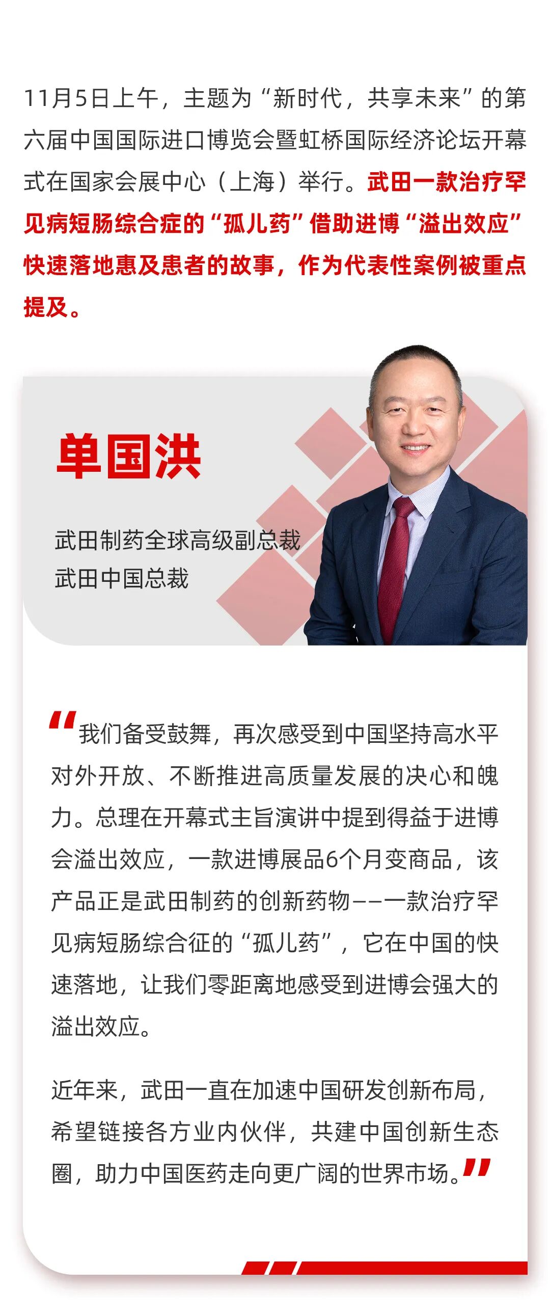 武田制药(东京证券交易所股票代码:4502)(纽约证券交易所股票代码:TAK)是一家总部位于日本、以价值观为基础、以研发为驱动的全球生物制药公司。武田致力于将科学研发成果转化为高度创新药品,为患者的健康生活和美好未来保驾护航。武田专注于四大治疗领域的药物研发:肿瘤、消化、神经科学及罕见病领域,并针对血液制品及疫苗领域进行专项研发投入。我们始终专注于高度创新药物的研发,通过开拓全新治疗方案、增强合作研发引擎实力,打造一条稳健且形式多样的产品管线,助力改善人们的生活。我们的员工遍布于大约80个国家和地区,与当地医疗健康合作伙伴携手,为全球患者带来健康福音。