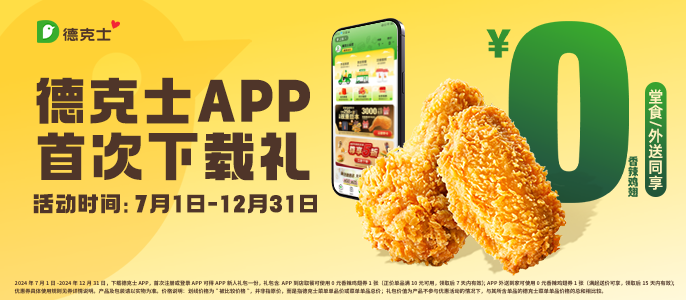 *价格说明:划线价格为“被比较价格”,并非指原价,而是指德克士菜单单品价或菜单单品总价;除非图示另有解释,否则图示如有立省的金额或折扣比例,是与其所含单品的德克士菜单单品价格的总和相比较。